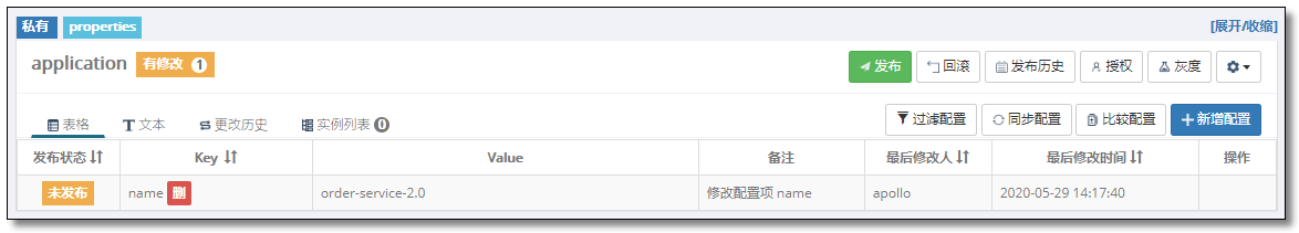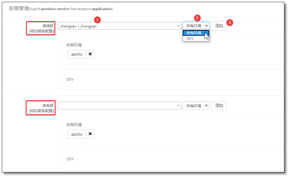 可以给指定用户添加对该应用的修改权和发布权,比如 order-service 是 apollo 创建的,但是我授权给了 zhangsan,zhangsan 再登录时也就可以操作这个项目了。