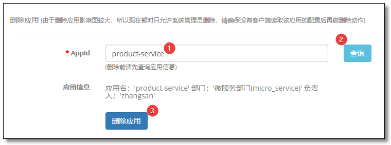 在删除应用栏目中的 AppId 处填写应用 id 先进行查询,查询到应用后点击删除应用即可。