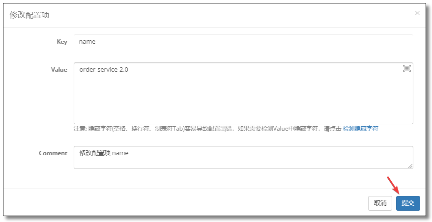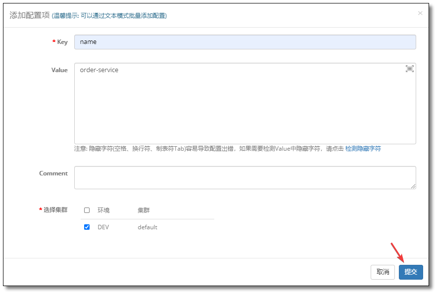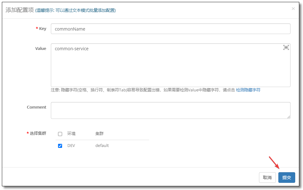 添加配置项信息,点击提交即可,刚添加的配置信息处于未发布状态。
