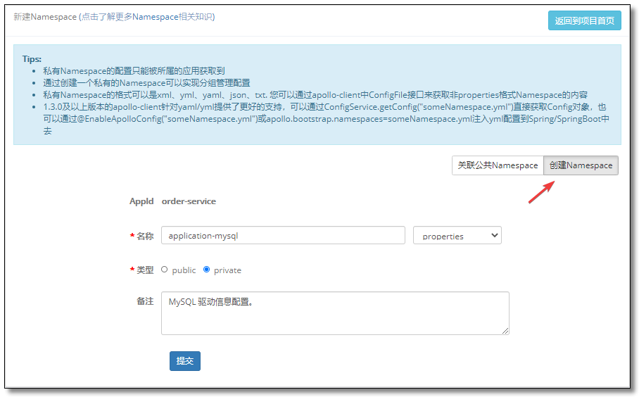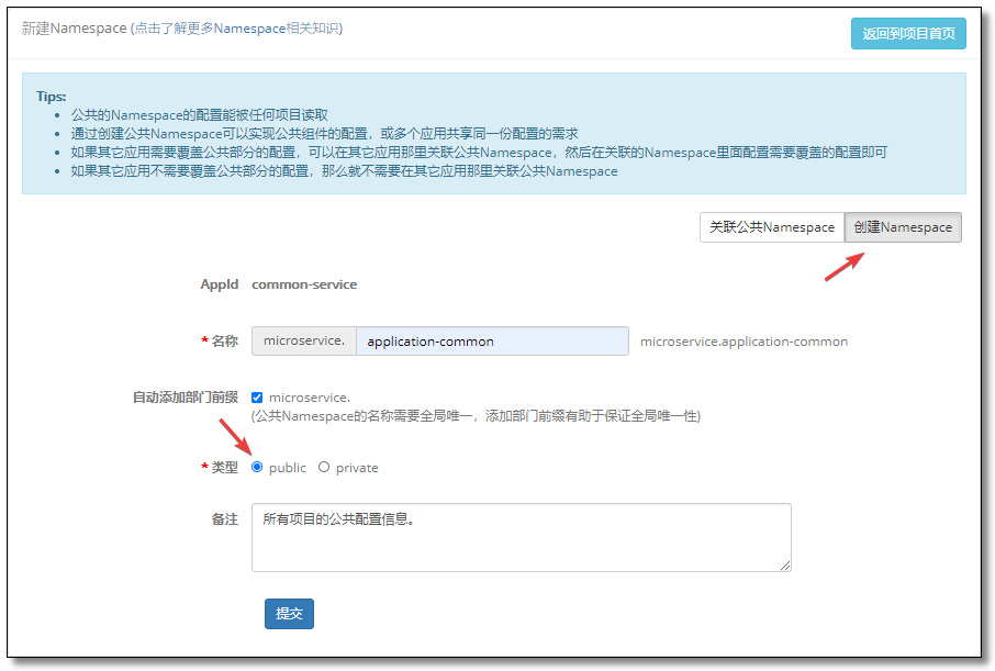 刚才添加 Namespace 时我们选择的是 private 私有配置,仅限本项目使用,如果有一些配置我们所有项目都需要使用,可以通过公共配置实现。