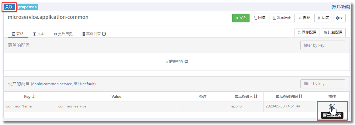 关联成功以后在项目首页可以看到关联的配置信息,且只能选择覆盖此配置,不能删除和修改配置信息(可以删除Namespace)。或者直接在私有配置下配置同名的配置项,同名的私有配置会比公共配置优先级高。