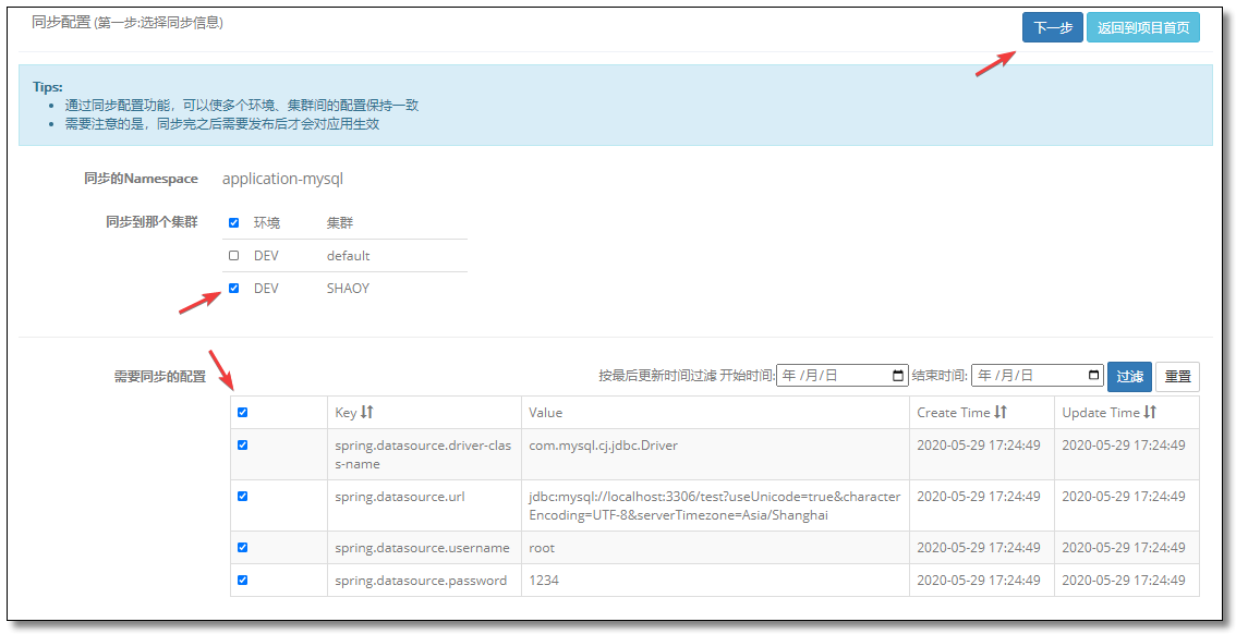 勾选需要同步的配置,选择要同步到哪个集群,然后点击下一步。