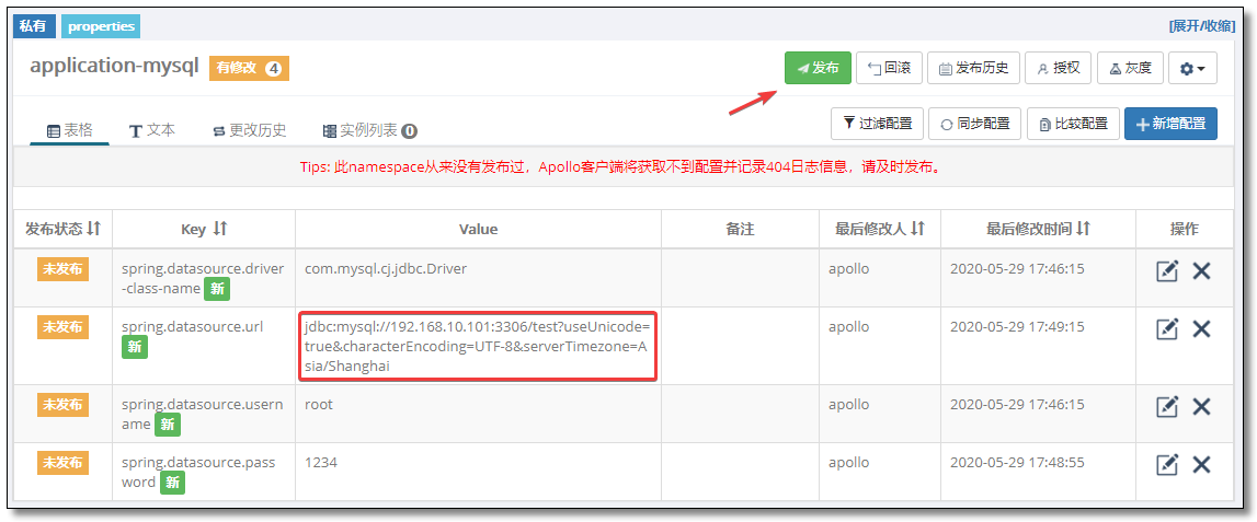数据已经同步过来了,我们根据需求修改了服务器地址为 192.168.10.101,然后发布配置。