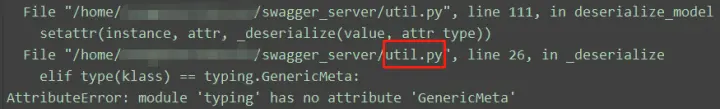在/swagger_server/util.py 文件中第26行,将 elif type(klass) == typing.GenericMeta: 改为 elif hasattr(klass, '__origin__'):即可。