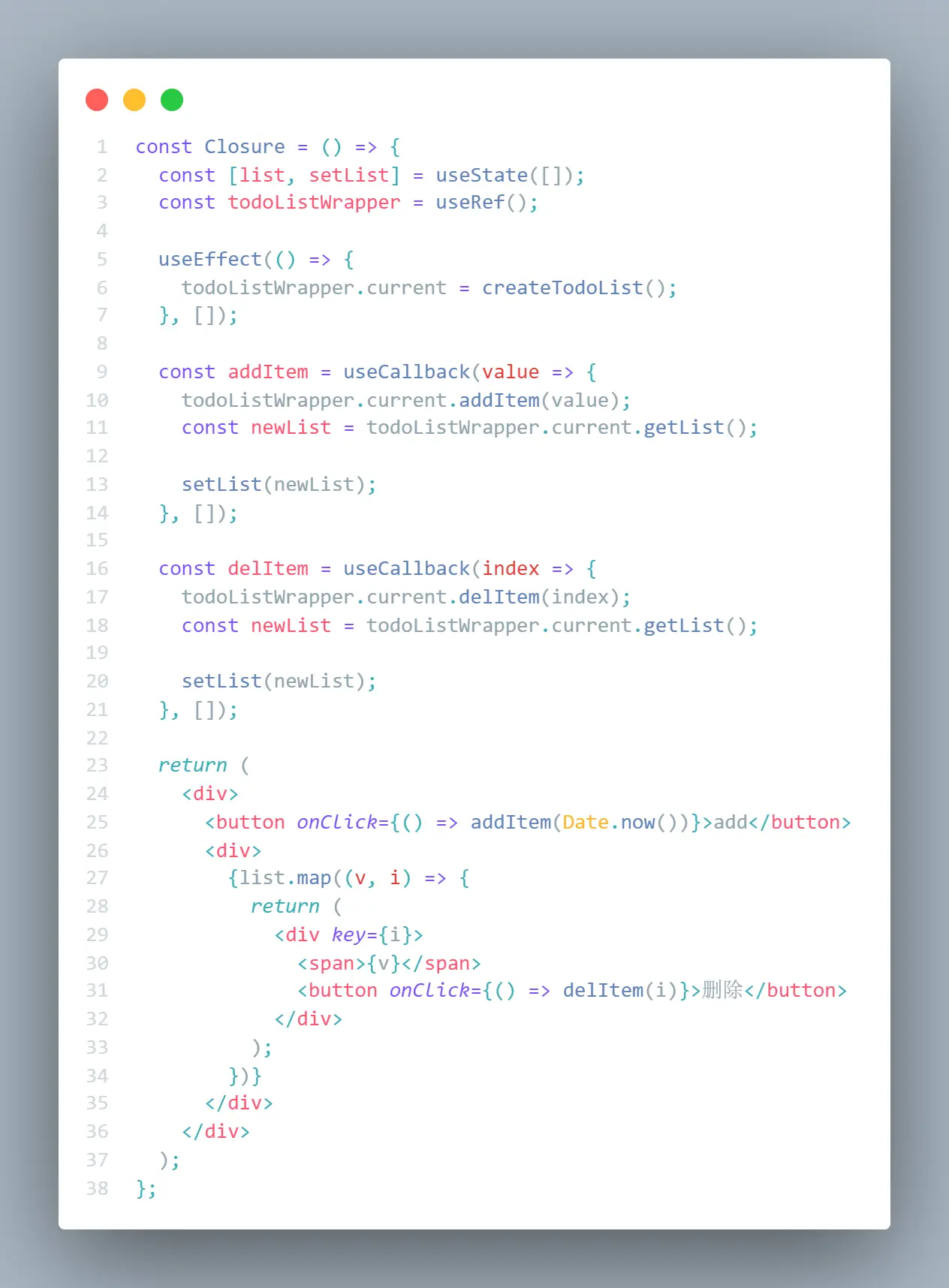 说干就干, 首先,在组件内部增加一个 useState 来记录 list , 然后在每次对闭包函数内部的 list 进行增、删后, 都去获取最新值,并更新到视图上。