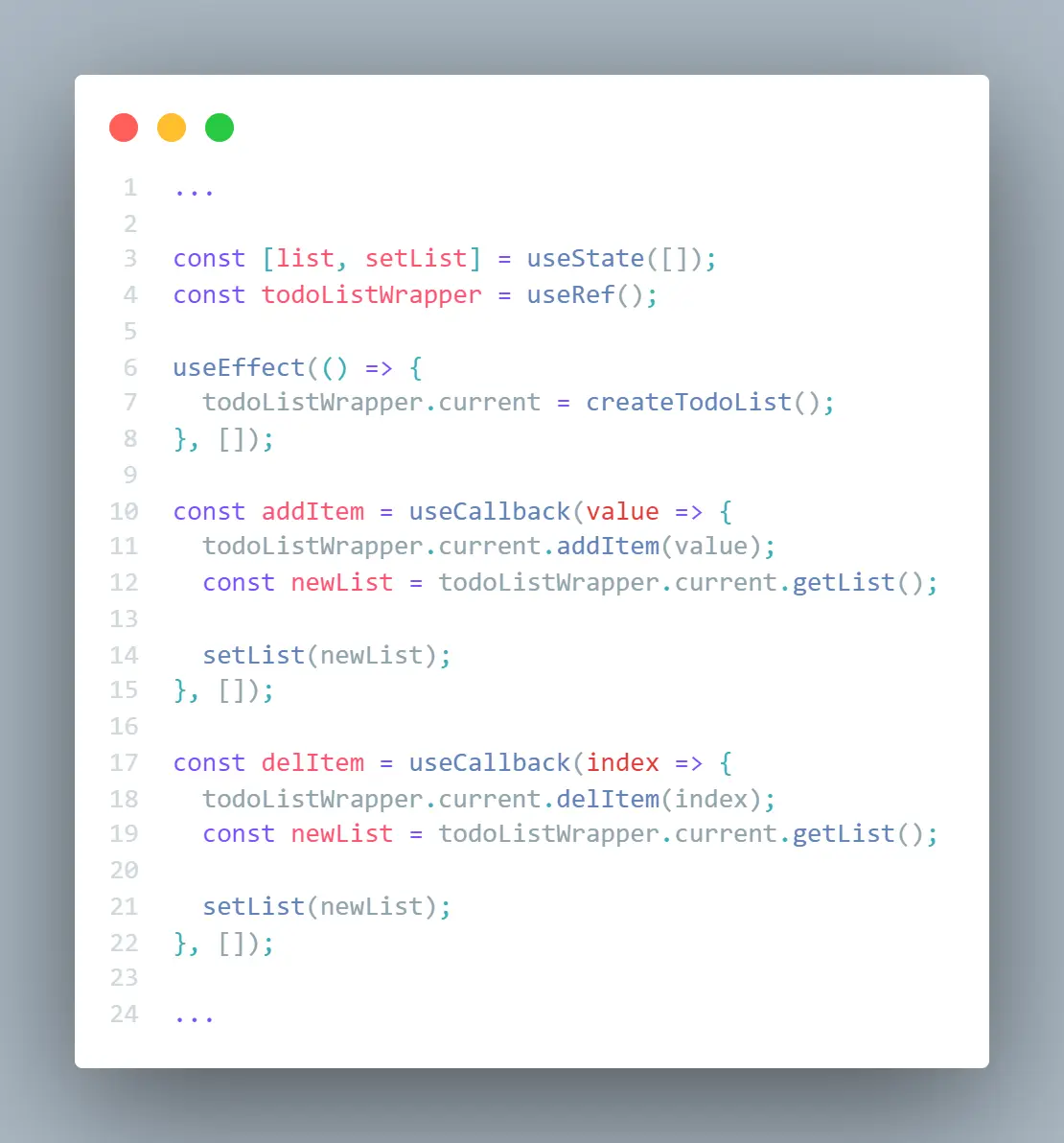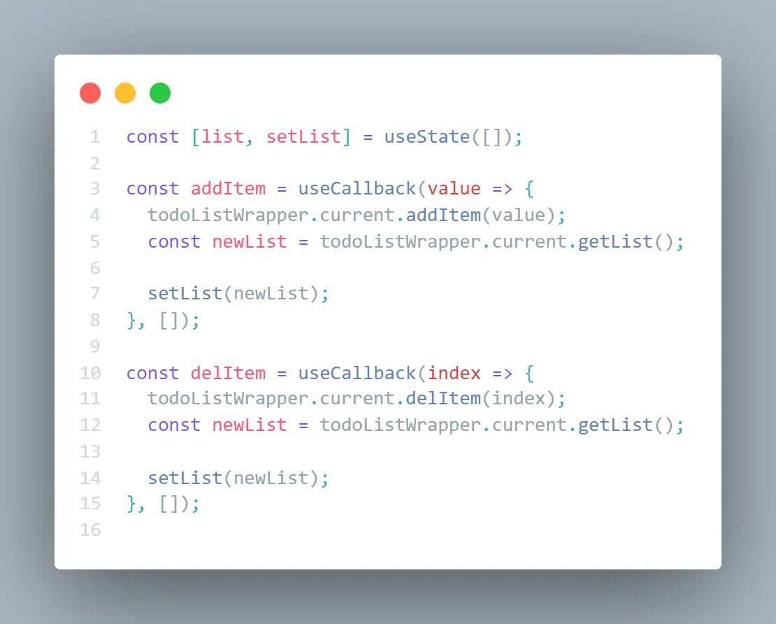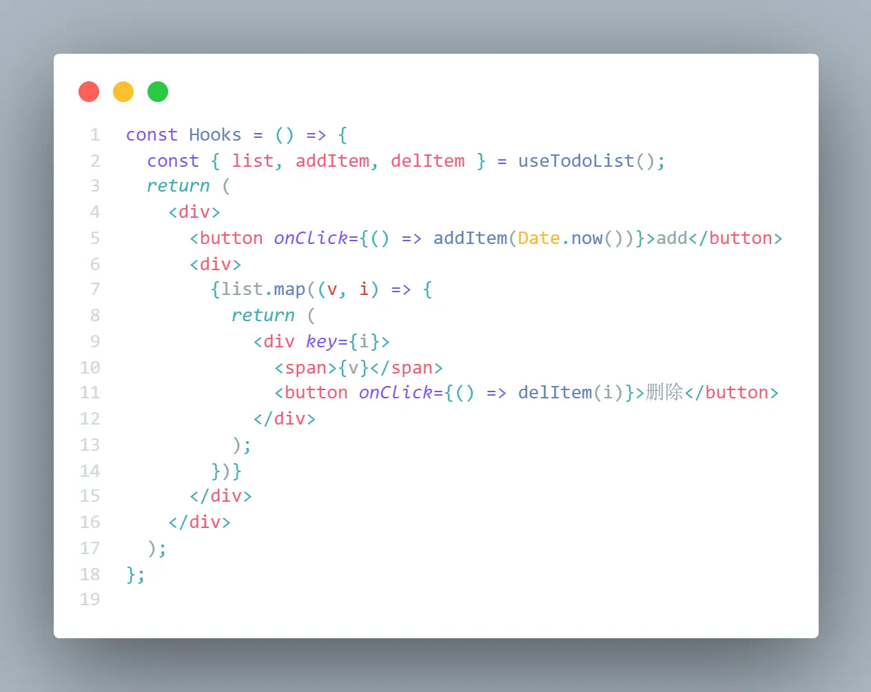 useTodoList 内部, 有记录一个 list 。以及有两个函数, 分别对list进行增加和删除。最后将 list,增加和删除逻辑return出去。然后外部组件中又去调用这增加删除逻辑, 修改了 hooks 中的数据, 然又引起外部组件的rerender