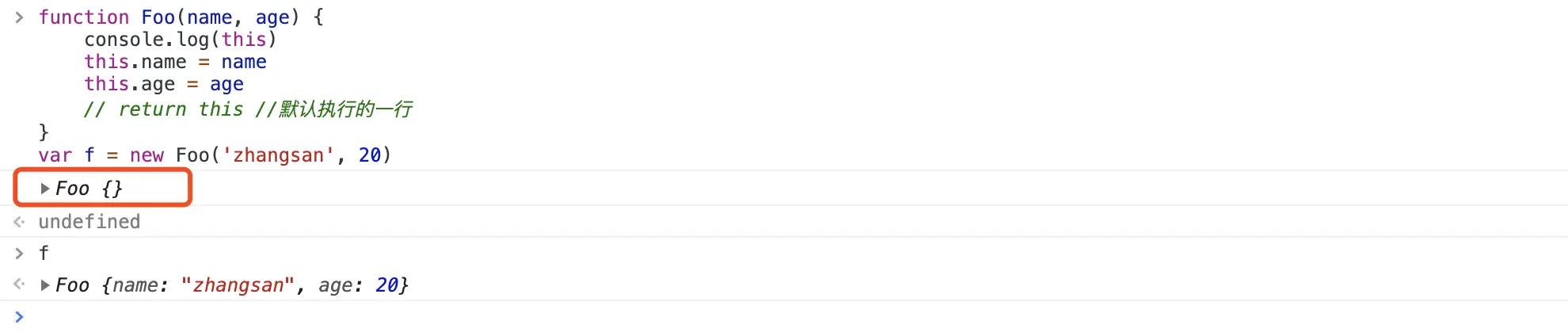 new 构造函数的过程:首先传参数name和age,this先是空对象,如下图所示打印出来的this是个空对象。然后是属性的赋值,把name和age赋值给this。再把this给return回来,return this这句是默认执行的。最后,this值 return回来后赋值给f。这个时候f就具备了f.name = 'shangsan',f.age=20这些属性。