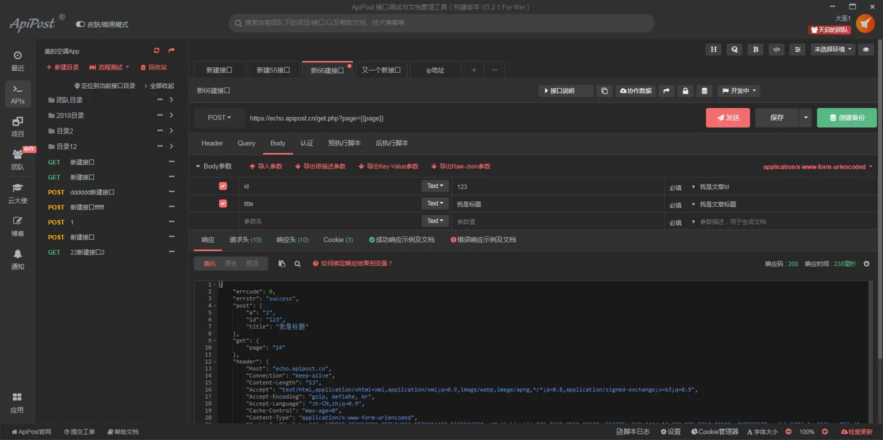 ApiPost是一个支持团队协作,并可直接生成文档的API调试、管理工具。它支持模拟POST、GET、PUT等常见请求,是后台接口开发者或前端、接口测试人员不可多得的工具 。使用者不仅可以利用apiopst调试接口,还可以书写相关注释(接口文档),方便的生成可读性好、界面美观的在线接口文档。