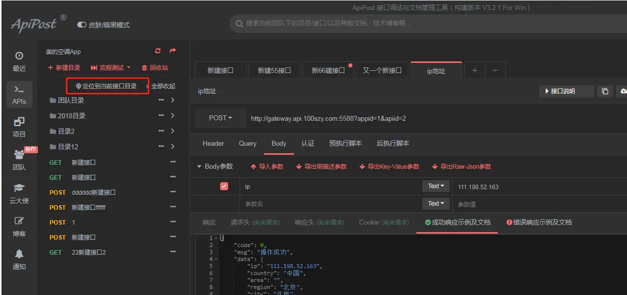 左侧的目录默认都是闭合的,有时候我们不知道当前正在编辑的接口属于哪个目录,找起来相当头疼。apipost提供了“定位到当前接口目录” 功能(见下图),可以快速打开当前正在编辑的接口、文档所在的目录,是不是解决了您的大问题了呢?