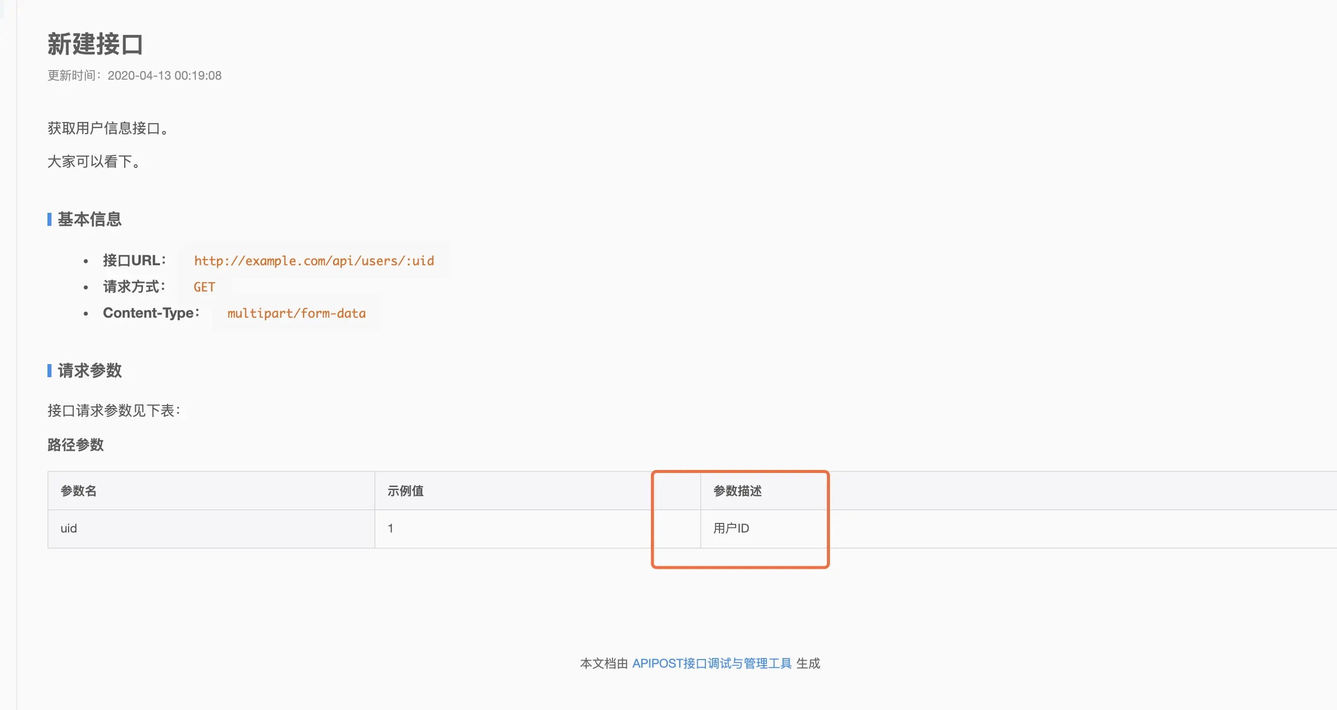 ApiPost支持把像这样的restful风格链接中的uid也就是1作为参数单独提出来比较方便调试和解释。