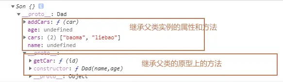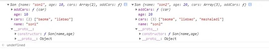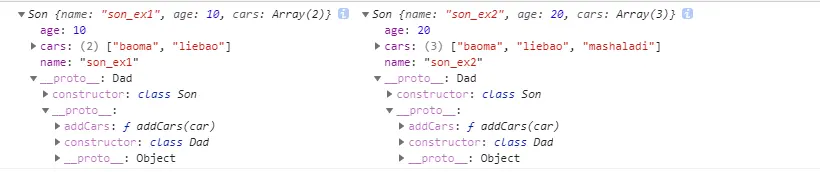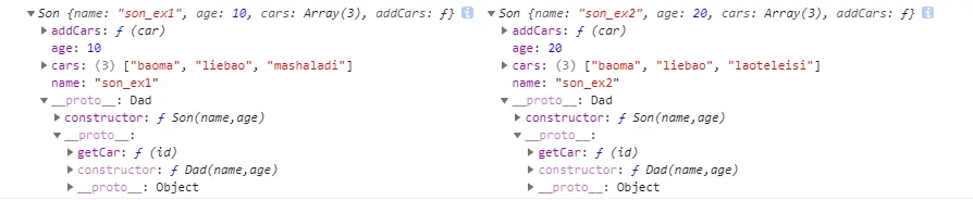 再来new 两个子类实例,传入name,age等属性,并添加son_ex2的车子。