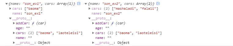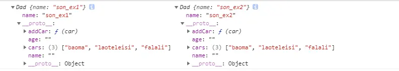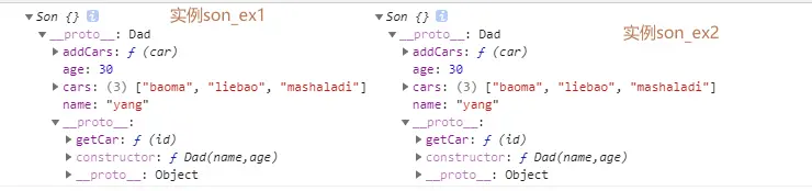cars是引用类型,实例son_ex2改变了值,实例son_ex1也同样改变了