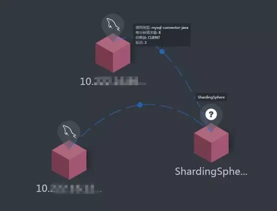 拓扑图展示ShardingSphere连接两个真实数据库,每个数据库中有两个表。拓扑图中可以显示出服务间的调用类型,请求量,平响等信息。