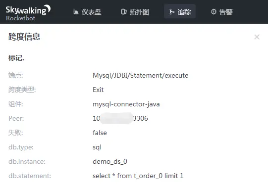 在追踪/Sharding-Sphere/executeSQL/的同一线程中,JDBC自动探针会展示真实SQL的详细信息。