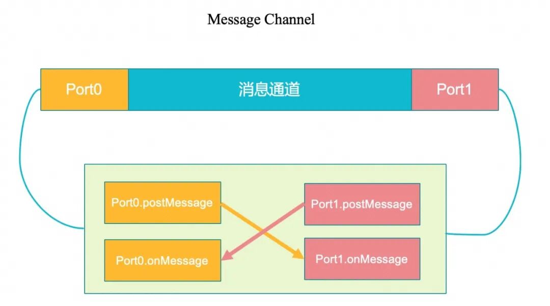 可以看出,基于容器总线的消息通道,一个消息从 Render 到 Worker 中间需要经过多次的序列化和反序列化,这是非常耗时的操作;不仅在小程序启动过程中影响小程序启动速度,小程序的滑动等交互事件都会有大量的 Worker 和 Render 之间的消息传递,所以也会影响帧率。 于是,基于 MessageChannel 的消息通道应运而生。 MessageChannel 允许我们创建一个新的消息通道,并通过它的两个 messagePort 属性发送数据。如下图所示,MessageChannel 会创建一个管道,管道的两端分别代表一个 messagePort,都能够通过 portMessage 向对方发送数据,通过 onmessage 来接受对方发送过来的数据。利用 MessageChannel 的特性,render 和 worker 之间的通信可以不通过 Nebula 总线,这样减少了消息的序列化和反序列化。
