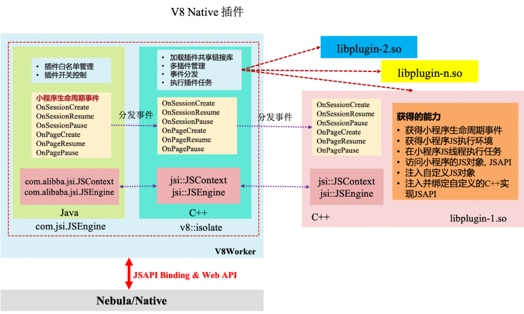 在 V8 Worker 中增加一层 C++ 插件代码,定义 Native 插件的接口,加载业务的动态链接库并管理插件。