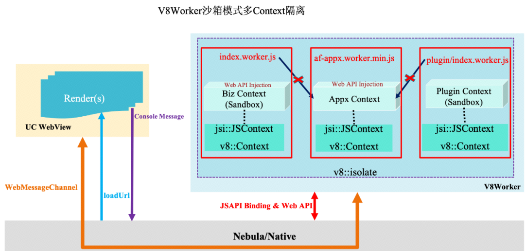 下图描述了多 V8 Context 隔离架构的 V8 Worker。对于同一个小程序,在同一个 V8 Isolate 下,分别为小程序前端框架脚本(af-appx.worker.minjs)、小程序业务脚本(index.worker.js)和小程序插件[15]脚本(plugin/index.worker.js)创建单独 APPX Context、Biz Context、Plugin Context(jsi::JSContext 就对应于 v8::Context)。同一个小程序可能会存在多个小程序插件,对于每一个插件都会分配一个单独 V8 Context 运行环境。 如 V8 Context 安全模型[16]所描述,同源即被定义为 Context,默认情况下不同的 Context 是不能相互访问的,除非通过 SetSecurityToken 设定安全令牌。正式利用了这一特性,我们将前端框架、小程序业务和小程序插件的 JS 运行环境进行了安全隔离。