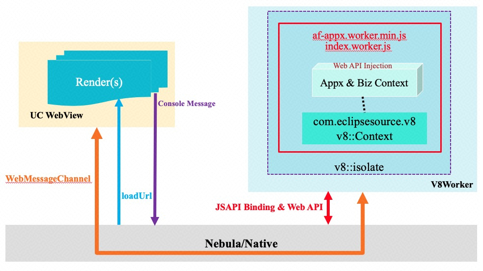 容器要加载运行 Render 部分的 JS 脚本,都是通过 WebView 的 loadUrl 进行;WebView 在运行 Render 部分的 JS 脚本(af-appx.min.js 和 index.js)之前,需要提前注入 APPX 框架需要用到的全局 JS 对象,如 window.AlipayJSBridge[10] 等,供 JSAPI 调用使用。