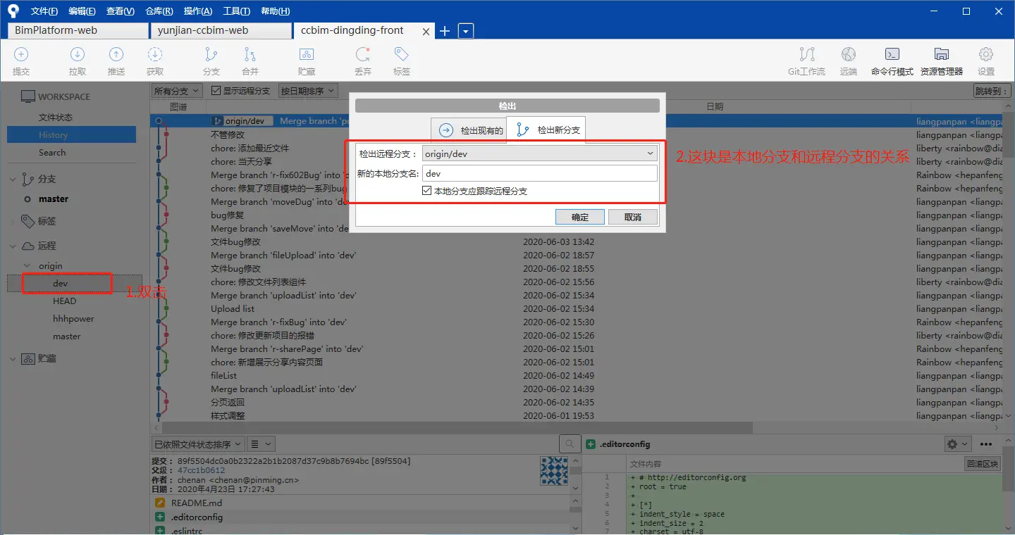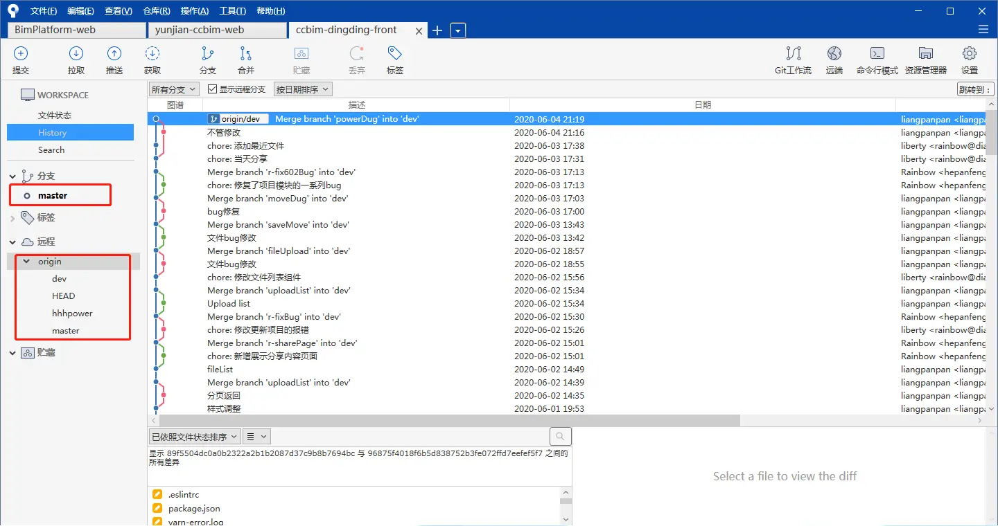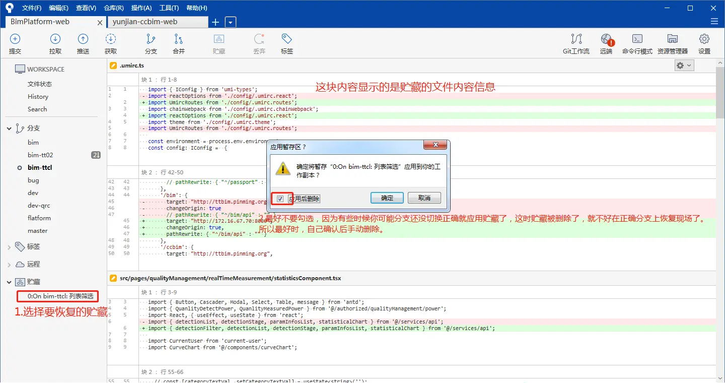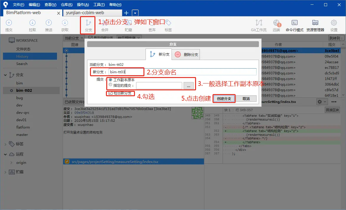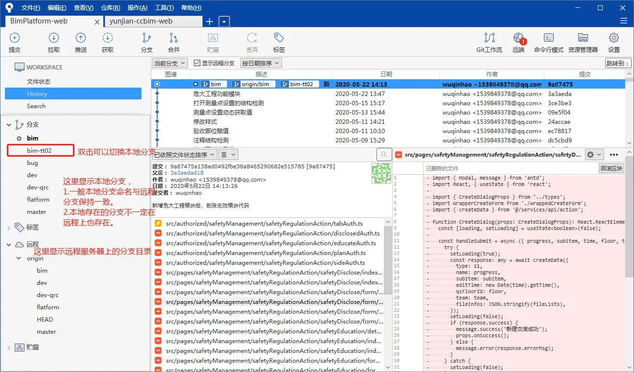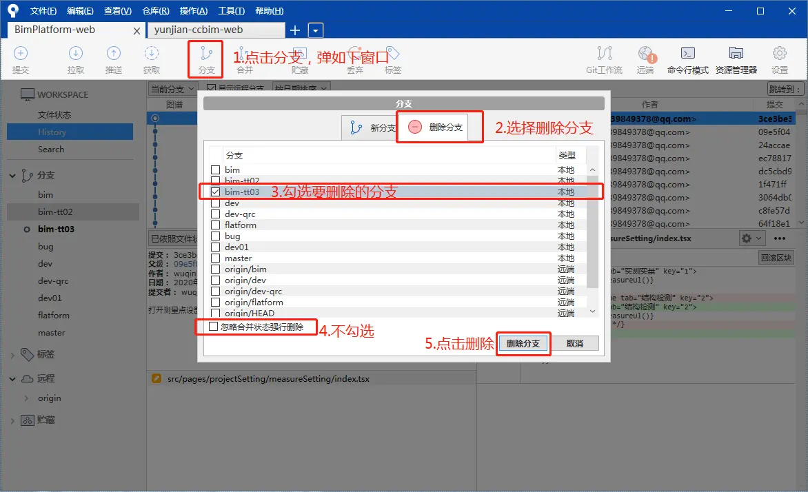 如果这个时候提醒你删除失败,那看下你当前在哪个分支,如图中所示你在bim-tt03分支,这时你要删除bim-tt03分支,这是不允许的,你要切换当前分支到其它分支,再来删除。
