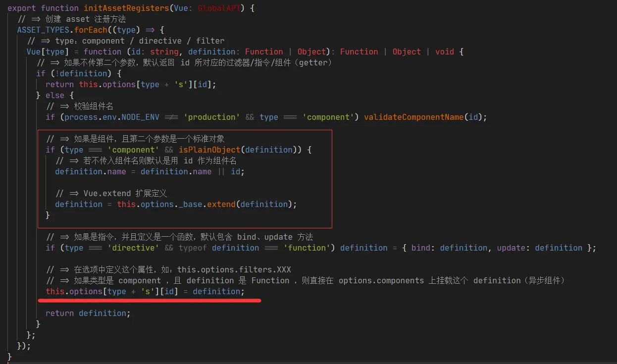 在解析静态资源(component)/ 执行 resolveAsset() 方法时,返回的是组件的定义,它的类型是函数。在注册静态资源时,这个函数定义是不做任何处理的(伏笔在这)。