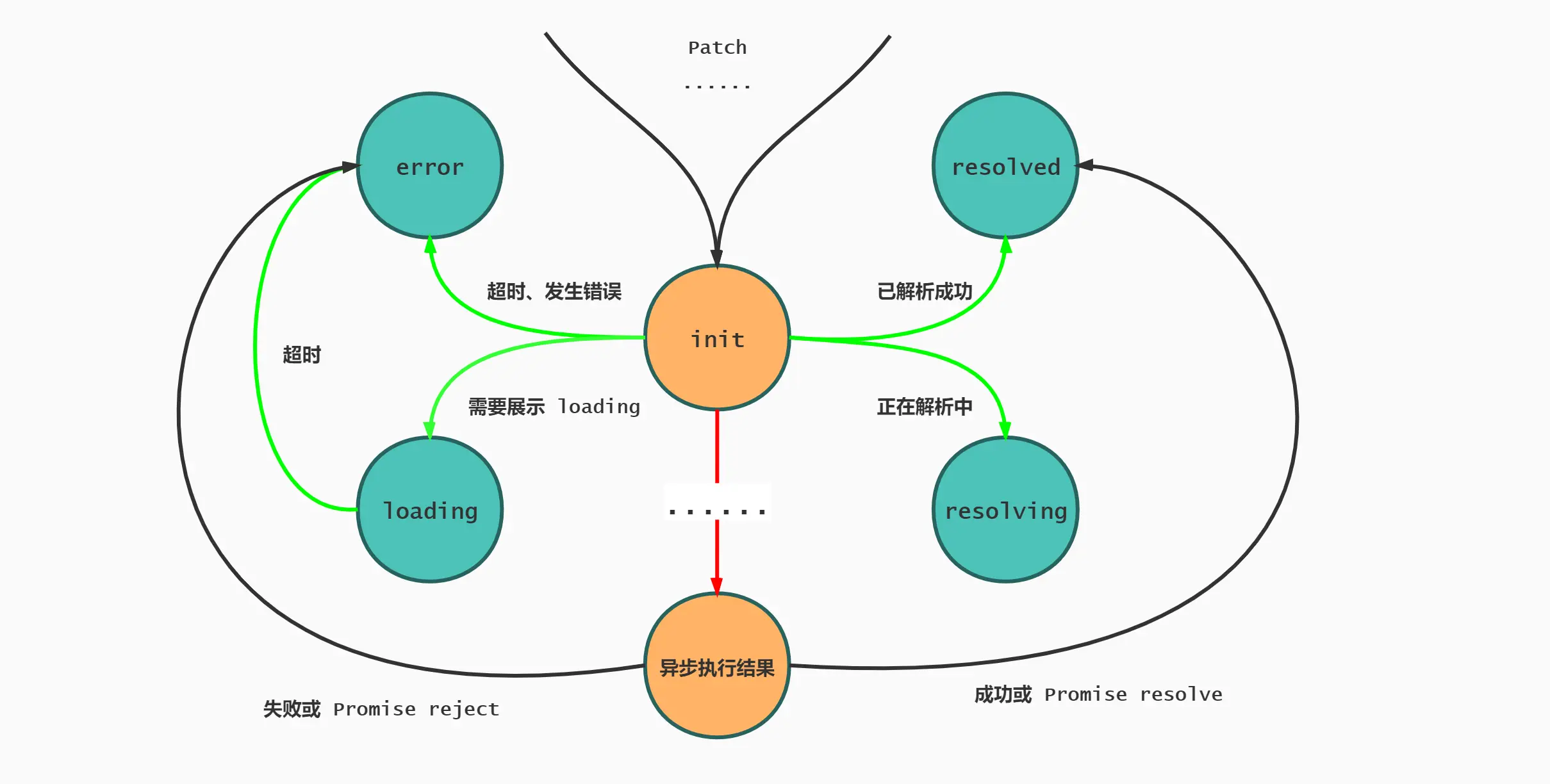 我对于这部分(异步组件工作流程)的理解,就把它当做了有限状态机来处理,大家都知道,异步事件最终会有不同的结果,这些结果就可以对应成不同的状态,例如:成功态、失败态、亦或是超时态。而这些不同的结果(状态),基本上都是有限的(能预知,能掌控)。所以咱们把它抽象成有限状态机,通过图文并茂的方式,更便于理解,希望本文对您有所帮助。