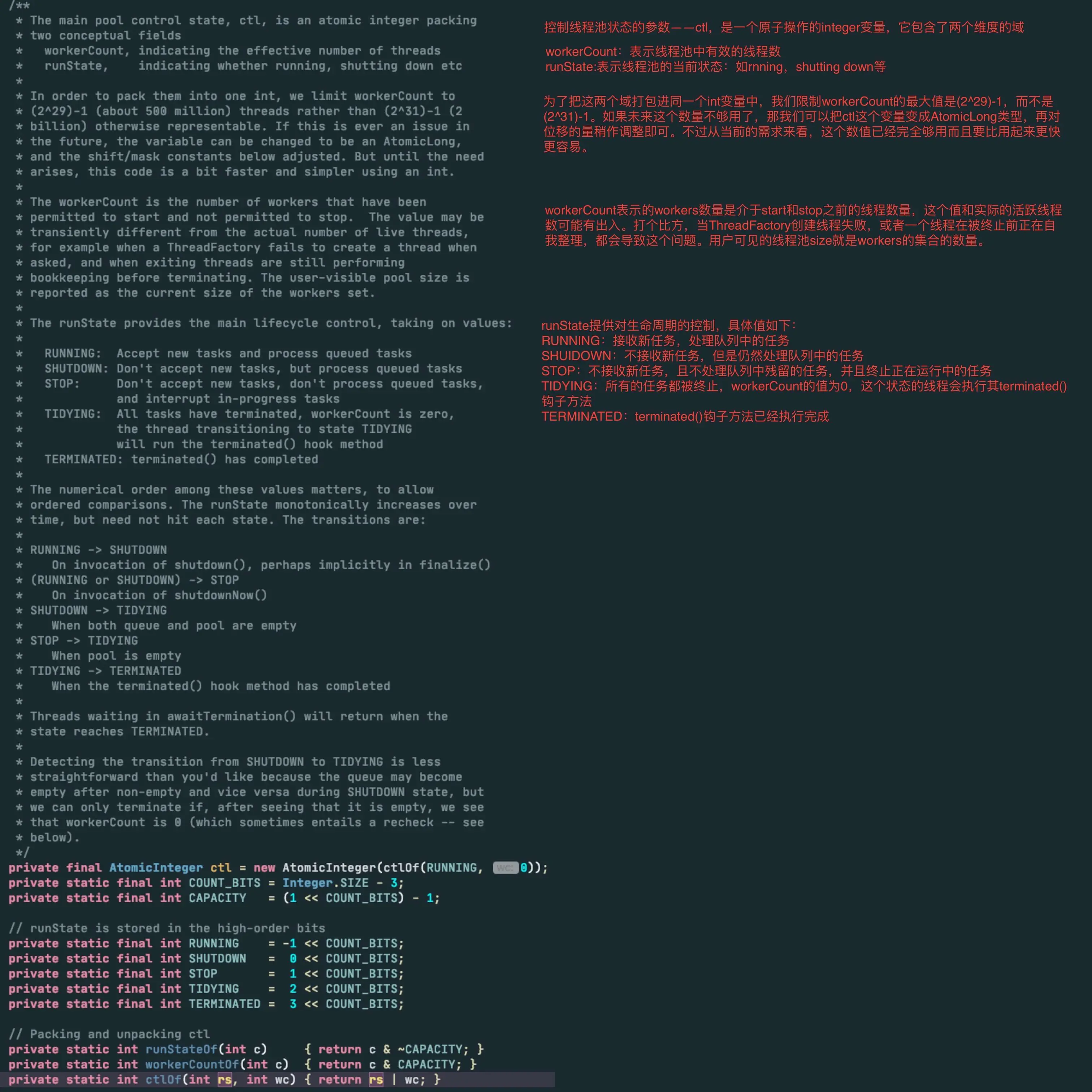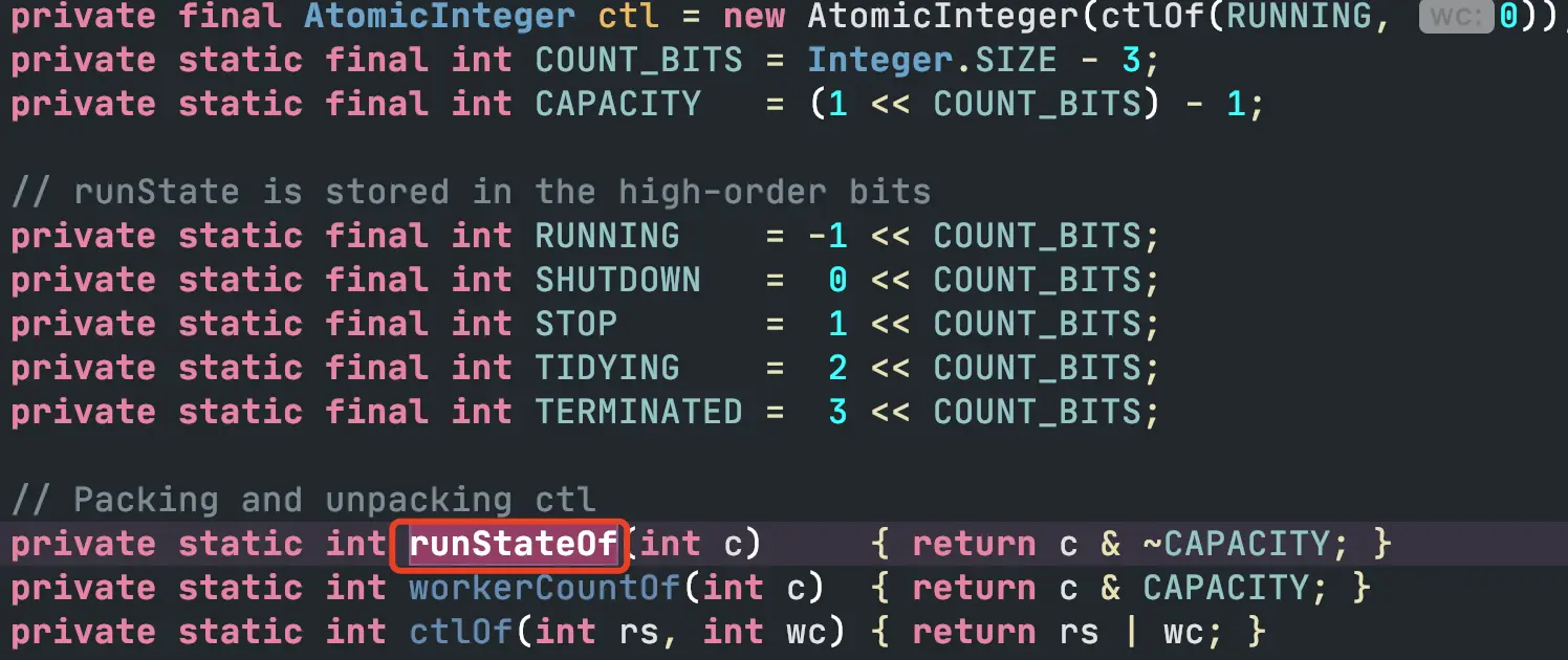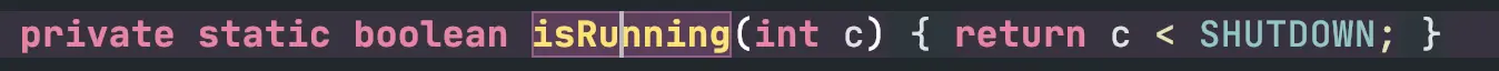 这里还有个设计的小细节,为什么只有RUNNING设置为负数,SHUTDOWN设置为0呢? 我们线程池判断状态的时候,最常用的一定是看他是否是运行状态,因此ThreadPoolExecutor类提供了isRunning方法: