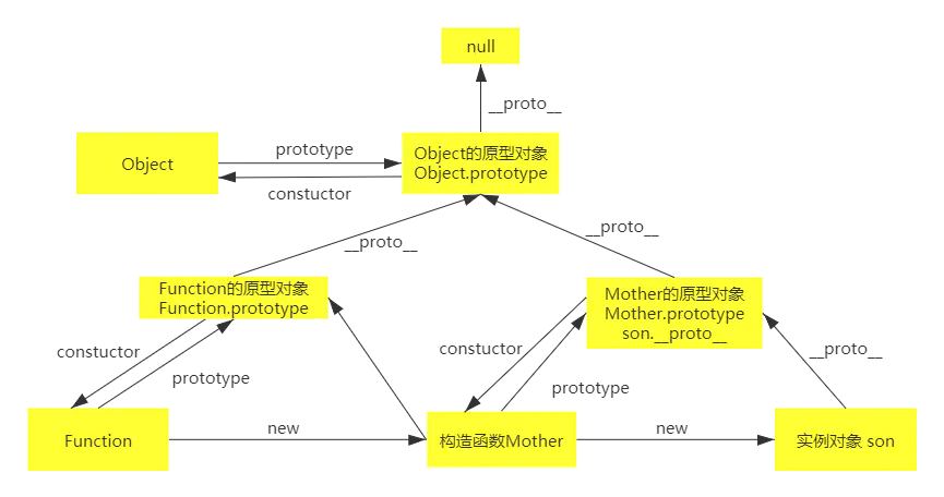 每一个构造函数(Person)都有一个原型对象(prototype);每个原型对象都包含一个指向构造函数的指针(constructor);每个实例都包含一个指向原型的内部指针(__proto__)。