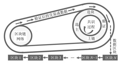 区块链系统建立在P2P网络之上, 其全体节点的集合可记为PP, 一般分为生产数据或者交易的普通节点, 以及负责对普通节点生成的数据或者交易进行验证、打包、更新上链等挖矿操作的"矿工"节点集合(记为M), 两类节点可能会有交集;矿工节点通常情况下会全体参与共识竞争过程, 在特定算法中也会选举特定的代表节点、代替它们参加共识过程并竞争记账权, 这些代表节点的集合记为D;D;通过共识过程选定的记账节点记为A.A.共识过程按照轮次重复执行, 每一轮共识过程一般重新选择该轮的记账节点.共识过程的核心是"选主"和"记账"两部分, 在具体操作过程中每一轮可以分为选主(Leader election)、造块(Block generation)、验证(Data validation)和上链(Chain updation, 即记账) 4个阶段.如图 1所示, 共识过程的输入是数据节点生成和验证后的交易或数据, 输出则是封装好的数据区块以及更新后的区块链. 4个阶段循环往复执行, 每执行一轮将会生成一个新区块。