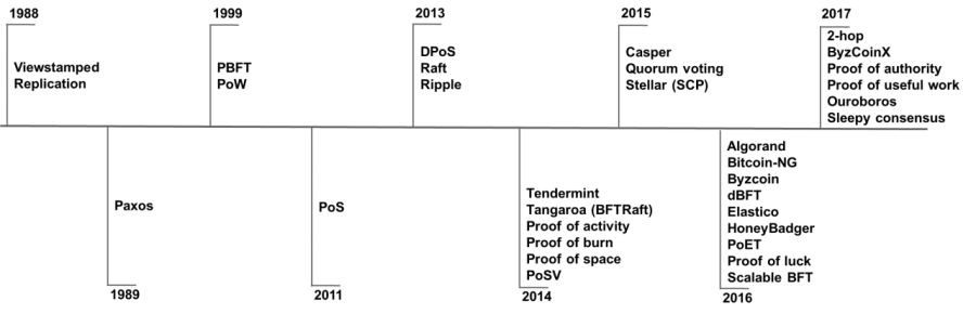 根据共识算法的提出时间,我们可以相对清晰的看到共识算法的发展。