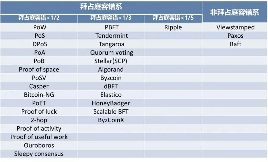 由于不同的区块链项目类型对信息记录和区块的生成有不同的要求,以及随着区块链技术的发展对共识机制的不断改善,目前一共约有超过30种共识机制。这些共识机制可以按照其拜占庭容错性能主要分成两类:拜占庭容错系和非拜占庭容错系。
