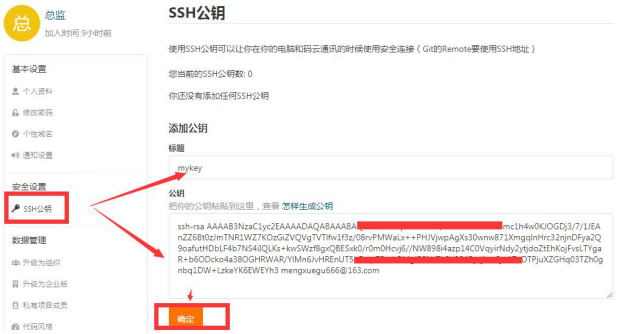 - 点击 SSH公钥,输入"标题"和"公钥"