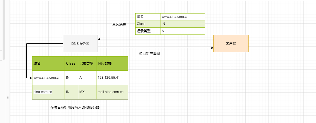 在我们申请到一个域名时,先要进行域名解析,此过程会将解析的内容保存到DNS服务器上,当客户端发送消息时便将符合要求的记录返回。如下图