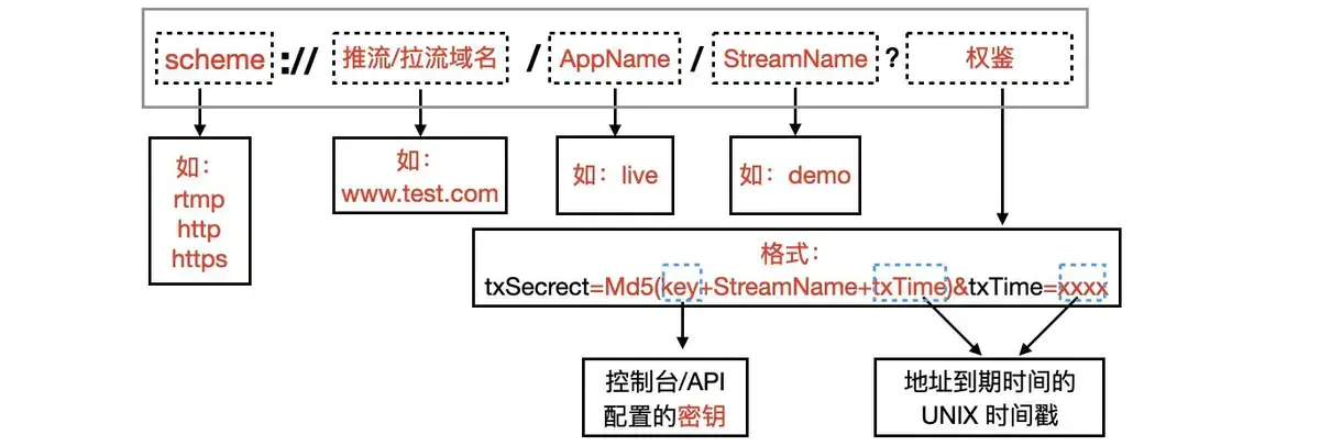 txSecrect=Md5(key+StreamName+txTime)&txTime=xxxx