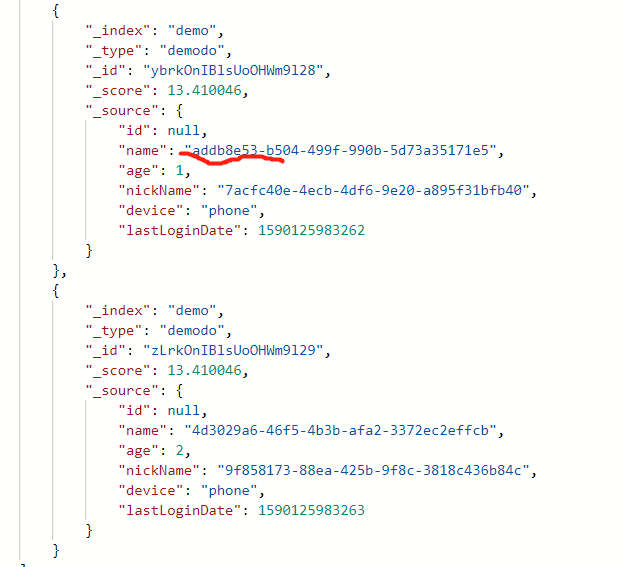 刚刚这种查询只是对这个字段进行了一次匹配,现在我们给name提供两个字符串来同时匹配。 下面这种查询,就是查出符合addb8e53 or 4d3029a6分词的结果。例如现在有 "name": "addb8e53-b504-499f-990b-5d73a35171e5" 和 "name": "4d3029a6-46f5-4b3b-afa2-3372ec2effcb" ,这时候这两个就会同时被查询出来。
