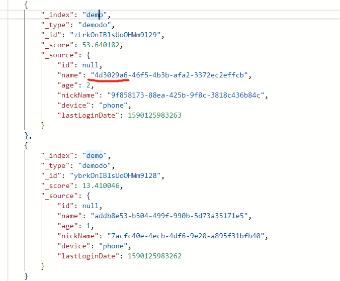 刚才我们说了,match查询是一个高级的全文查询,同时具有分词查询和精确查询的能力,上面这段查询方式,用的就是分词查询,name字段是字符串类型,value我写的是一段UUID,分词器根据 - 进行了分词,addb8e53是这个UUID中的其中一段,所以我可以使用这种方式查询到多个包含这个分段的结果,如果我需要精确查询,则只需要在name后面加上一个.keyword即可,由"name": "addb8e53"变成"name.keyword": "addb8e53",spring data查询同理。