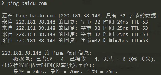 这时我们可以用在终端里用ping命令查看域名信息: