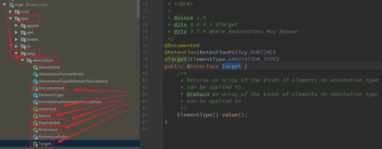 在JDK的java.lang.annotation包下定义了6个元注解:@Documented、@Inherited、@Native、@Repeatable、@Retention和@Target,如下图所示: