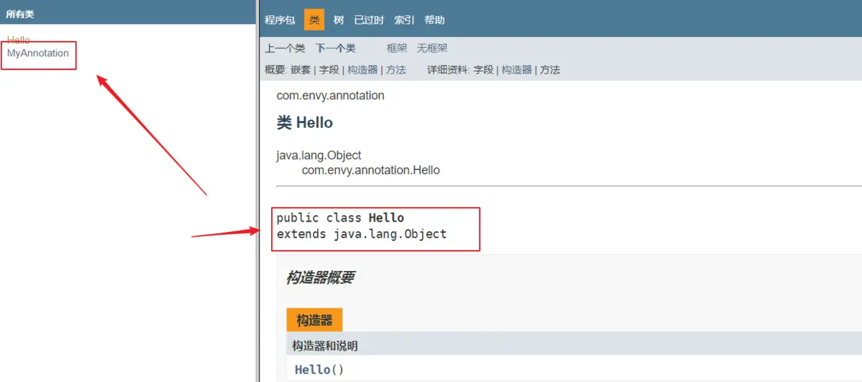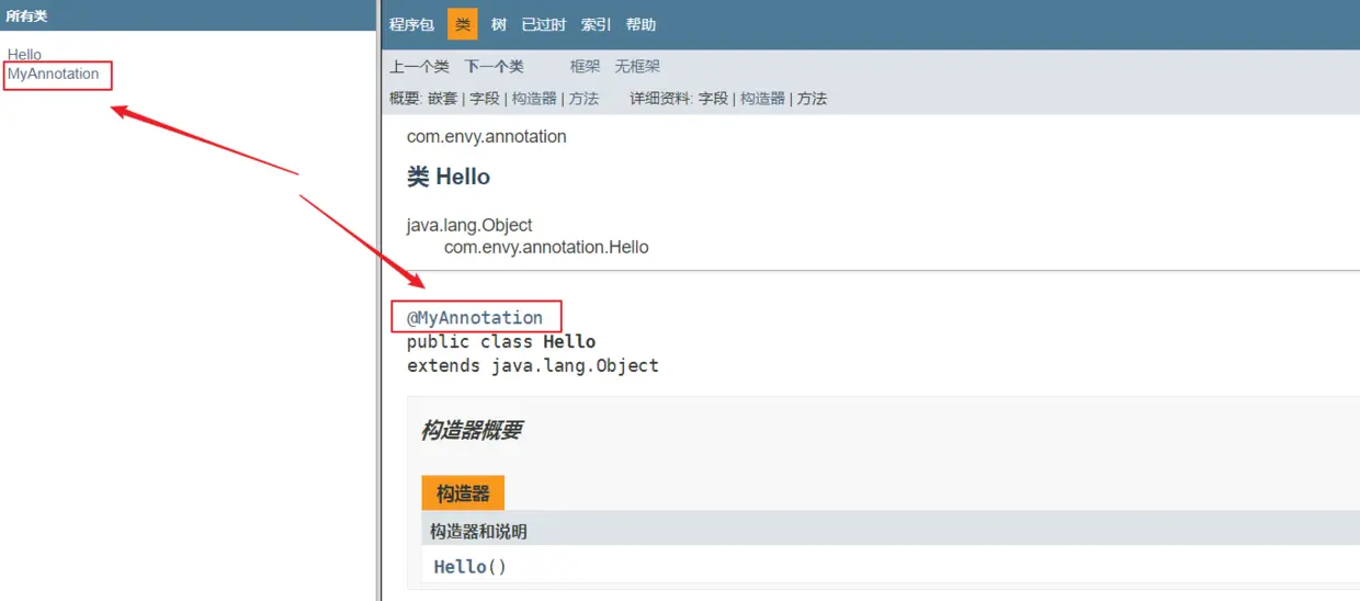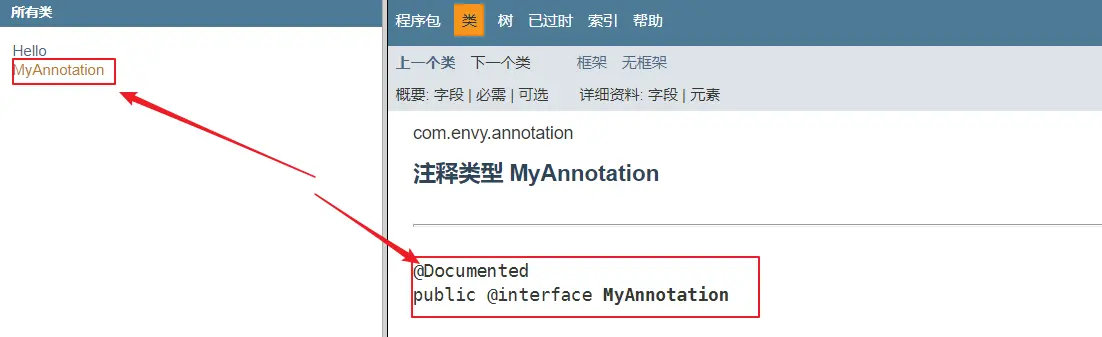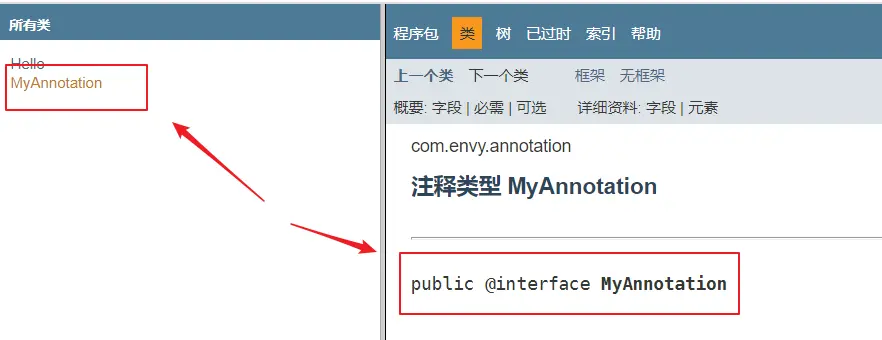 现在尝试删除这个doc目录,且去掉MyAnnotation注释上的@Documented注解,再来运行一下上述命令,可以发现此时生成的index.html文件中就没有对注释类型的说明了: