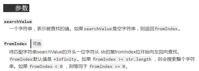 语法:str.lastIndexOf(searchValue, fromIndex)