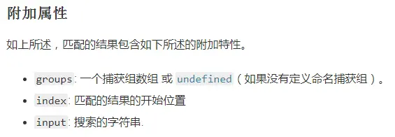注意:如果使用g标志,则将返回与完整正则表达式匹配的所有结果,但不会返回捕获组。 如果未使用g标志,则仅返回第一个完整匹配及其相关的捕获组(Array)。 在这种情况下,返回的项目将具有如下所述的其他属性:
