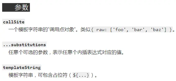 console.log(res2); //a1b2c 多余的参数被裁减掉了作用:String.raw()返回给定模板字符串的原始字符串,这是唯一一个内置的模板字符串标签函数。