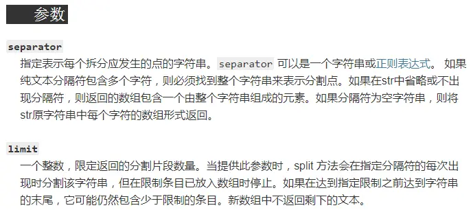 注意:如果没有找到或者省略了分隔符,则该数组包含一个由整个字符串组成的元素。如果分隔符为空字符串,则将str转换为字符数组。如果字符串仅由一个分隔符实例组成,则该数组由两个空字符串组成。