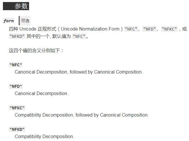 36、normalize()返回给定的 Unicode 规范化形式的字符串