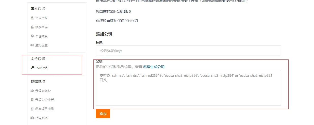 - 登录你的gittee账户,点击头像进入设置页面,找到安全设置里面的SHH公钥,
