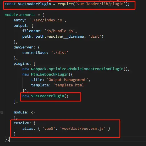 要处理vue组件还需要在webpack.config.js配置文件中引入插件,以下标出来的是要新增的: