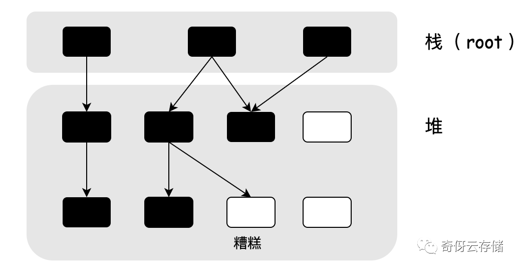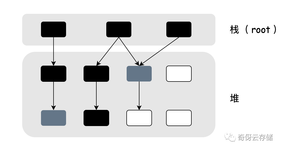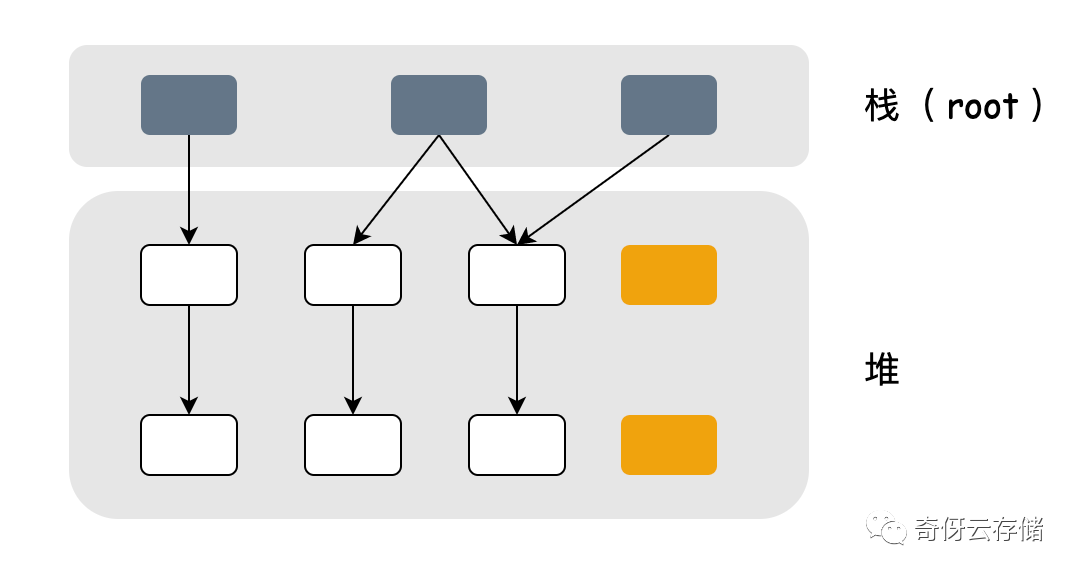 - 栈是根,是扫描的起点,还有一些全局变量也是根,是起点