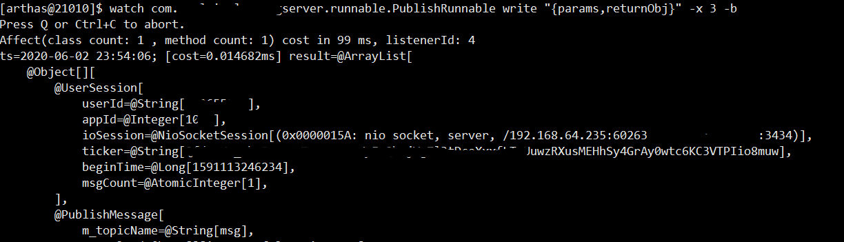 用Arthas的watch命令,观察write方法的输入参数。