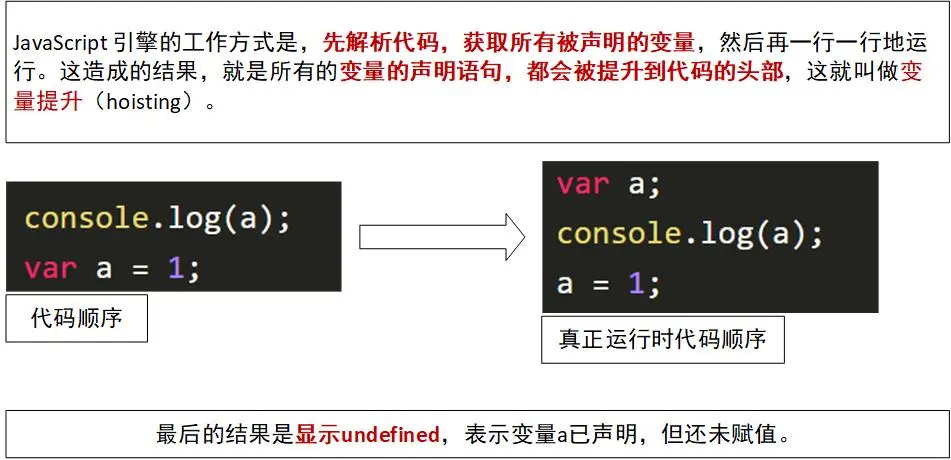 var重新声明一个已经存在的变量,是无效的。 但是,如果第二次声明的时候还进行了赋值,则会覆盖掉前面的值。 - 变量提升--变量的什么被放在最前面,赋值在原来的位置。
