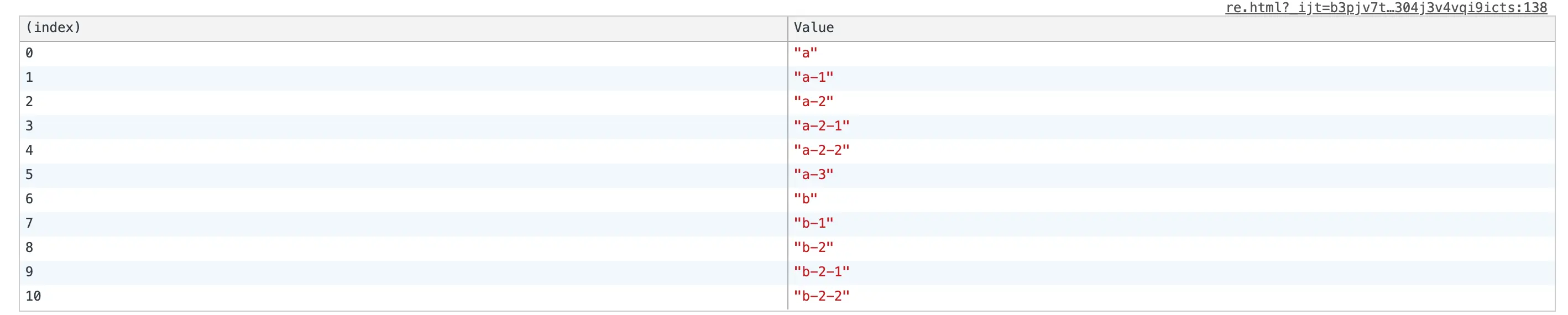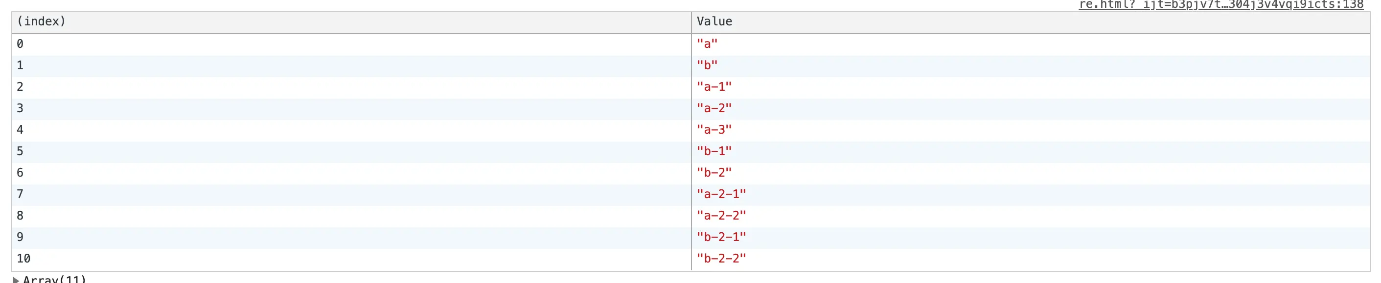 }非递归的方式我们将传入的数据(一般是引用类型),进行拷贝,重新开辟一份内存空间,防止污染传入的数据,因为数组的shift()方法会改变原有的数组结构,所以这里while循环体内数组的长度来判断什么时候结束循环,循环体内根据是否存在下级的children进行stack新数组的操作,两种方式的遍历结果如下: