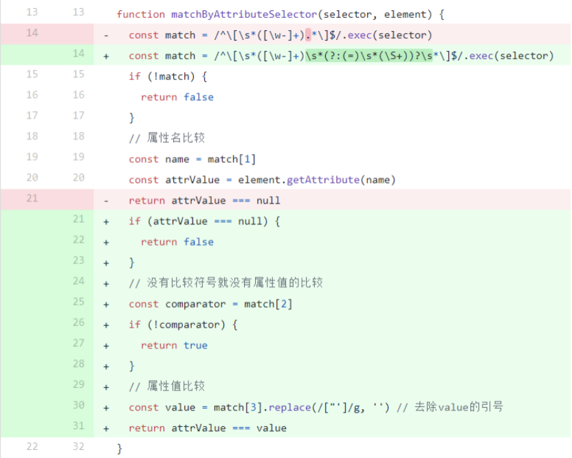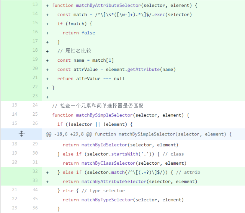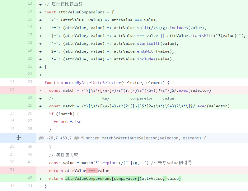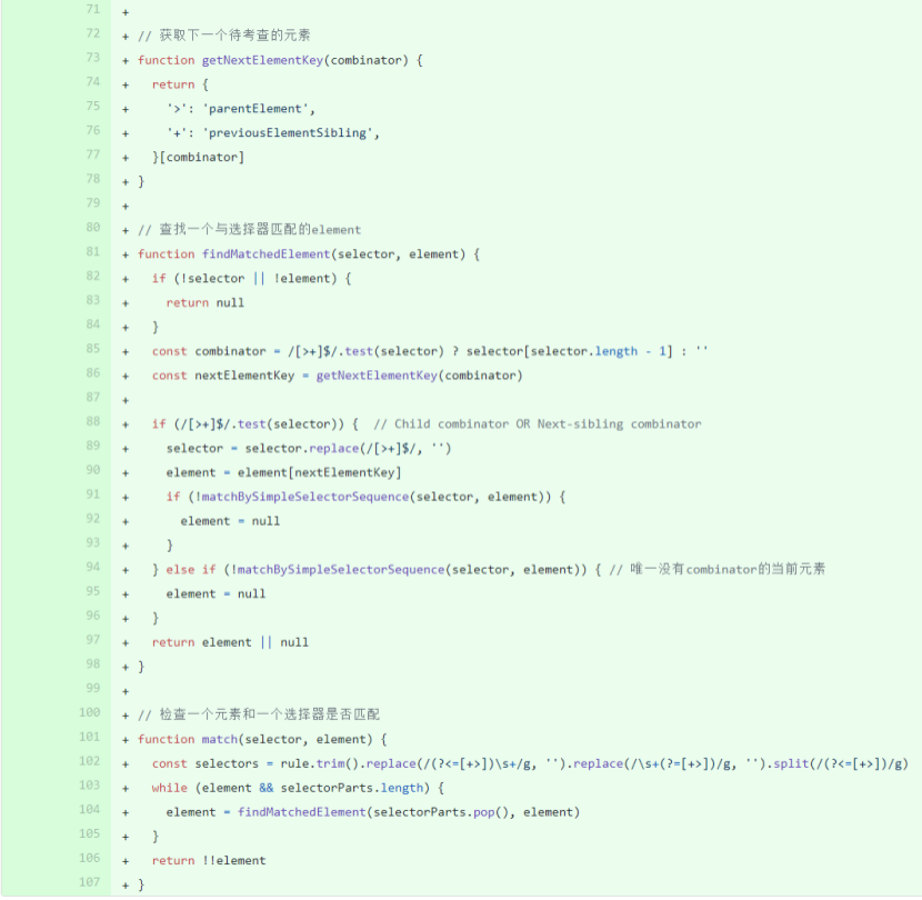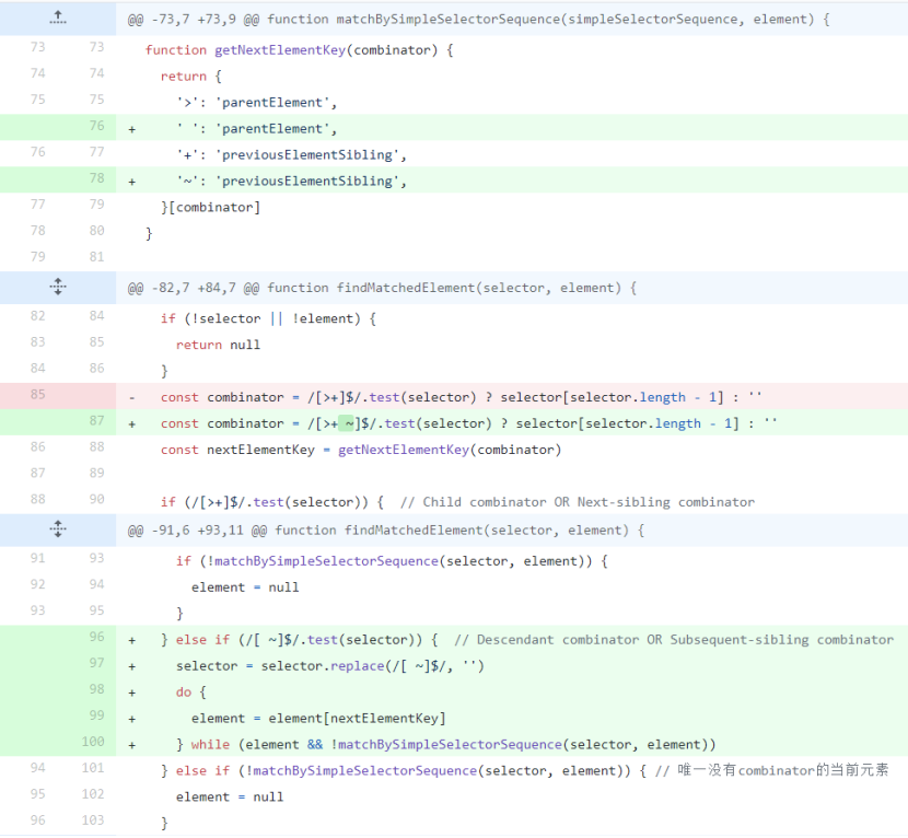 这样一来,这个match函数就可以支持tag,id,class,attr,:not的任意组合的 简单选择器,也支持空格、~、>、+四种组合器的任意组合的 复杂选择器 了。